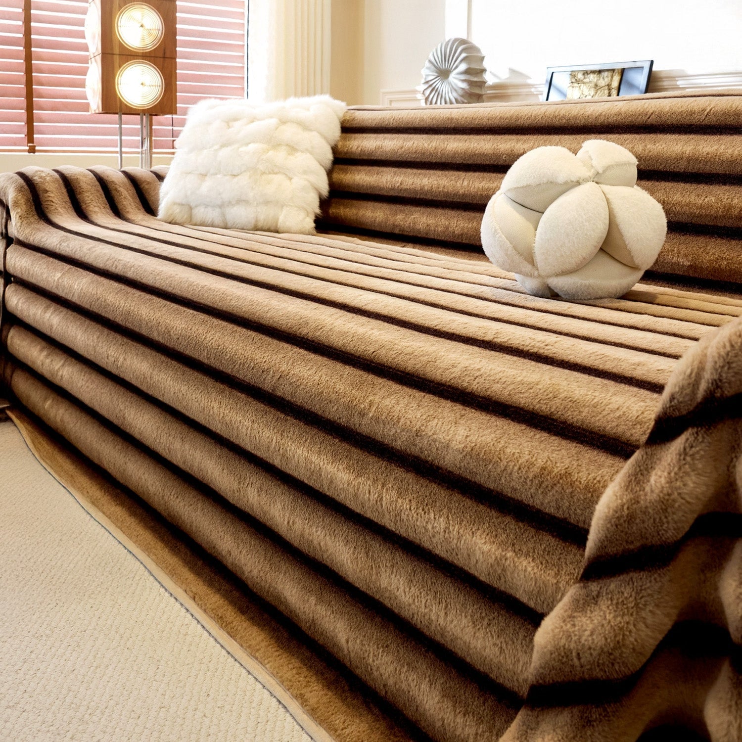 Indulge in the ultimate comfort and sophistication with our Luxury Stripe Faux Fur Sofa/Couch Cover, designed to transform your living space into a warm and inviting retreat. Featuring an elegant wide-stripe texture and crafted from ultra-soft faux fur, this cover delivers both visual luxury and tactile pleasure — perfect for the cozy autumn and winter seasons.