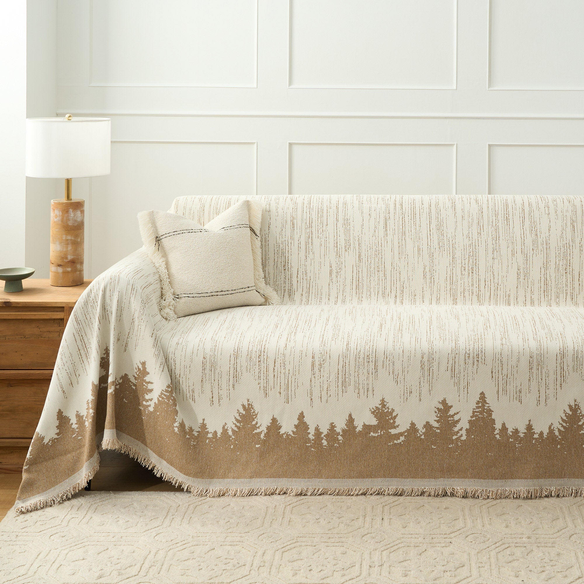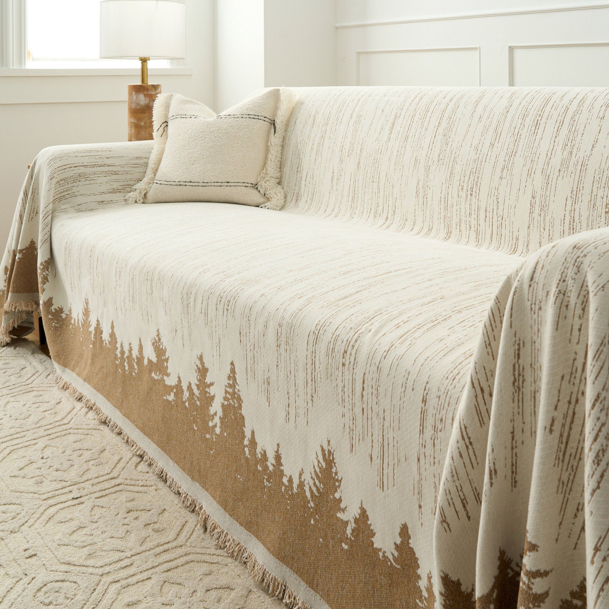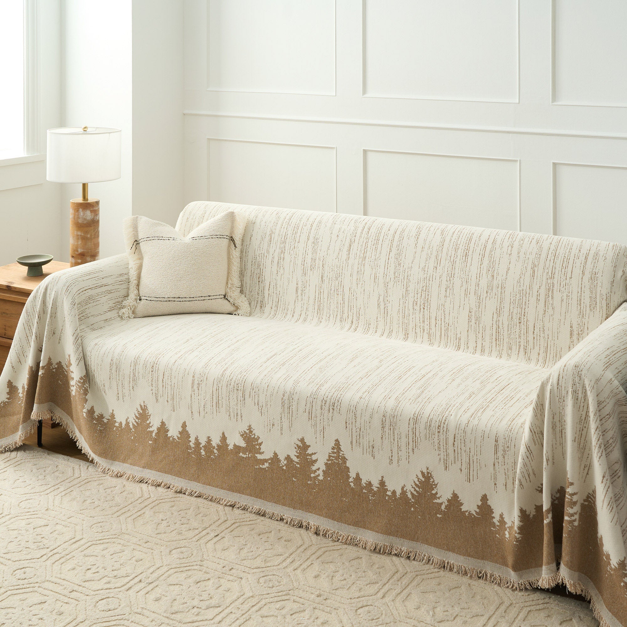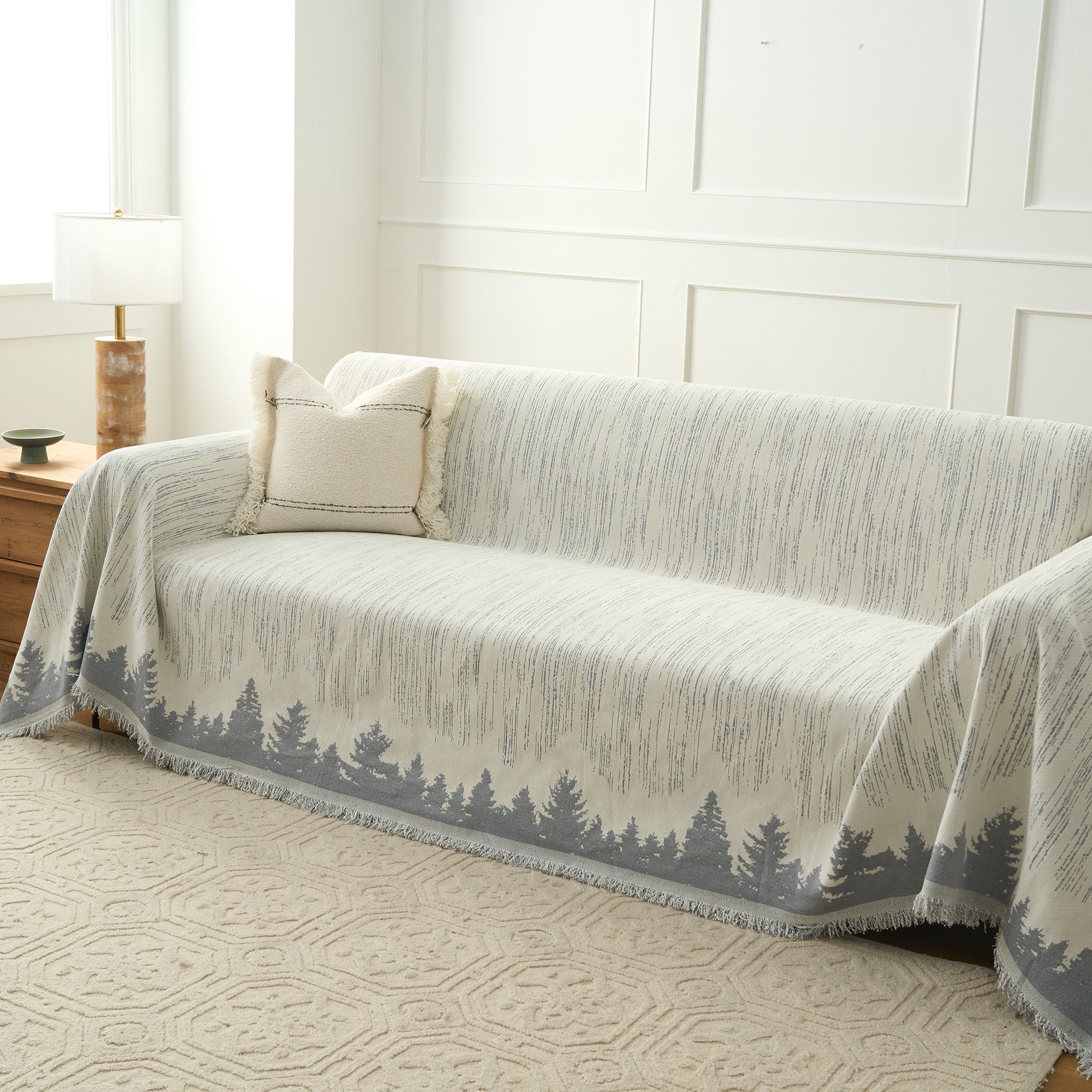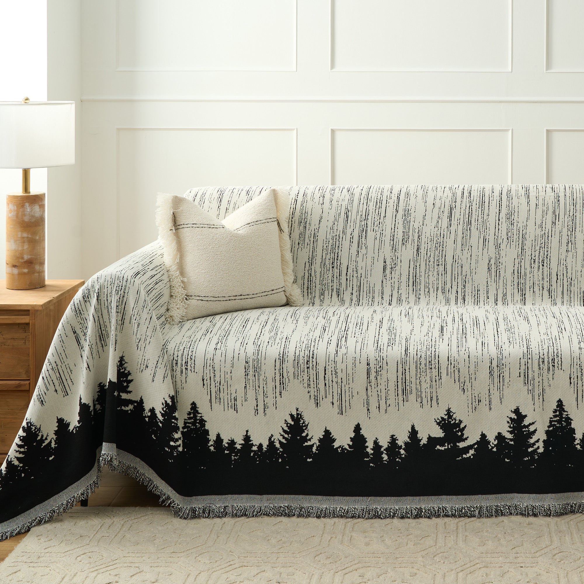 Transform your living space into a serene woodland retreat with this Forest Silhouette Sofa Cover. The minimalist black-and-white design features a stunning tree line against a textured backdrop, adding a touch of nature's tranquility to your home. Perfect for protecting your furniture while elevating your decor.