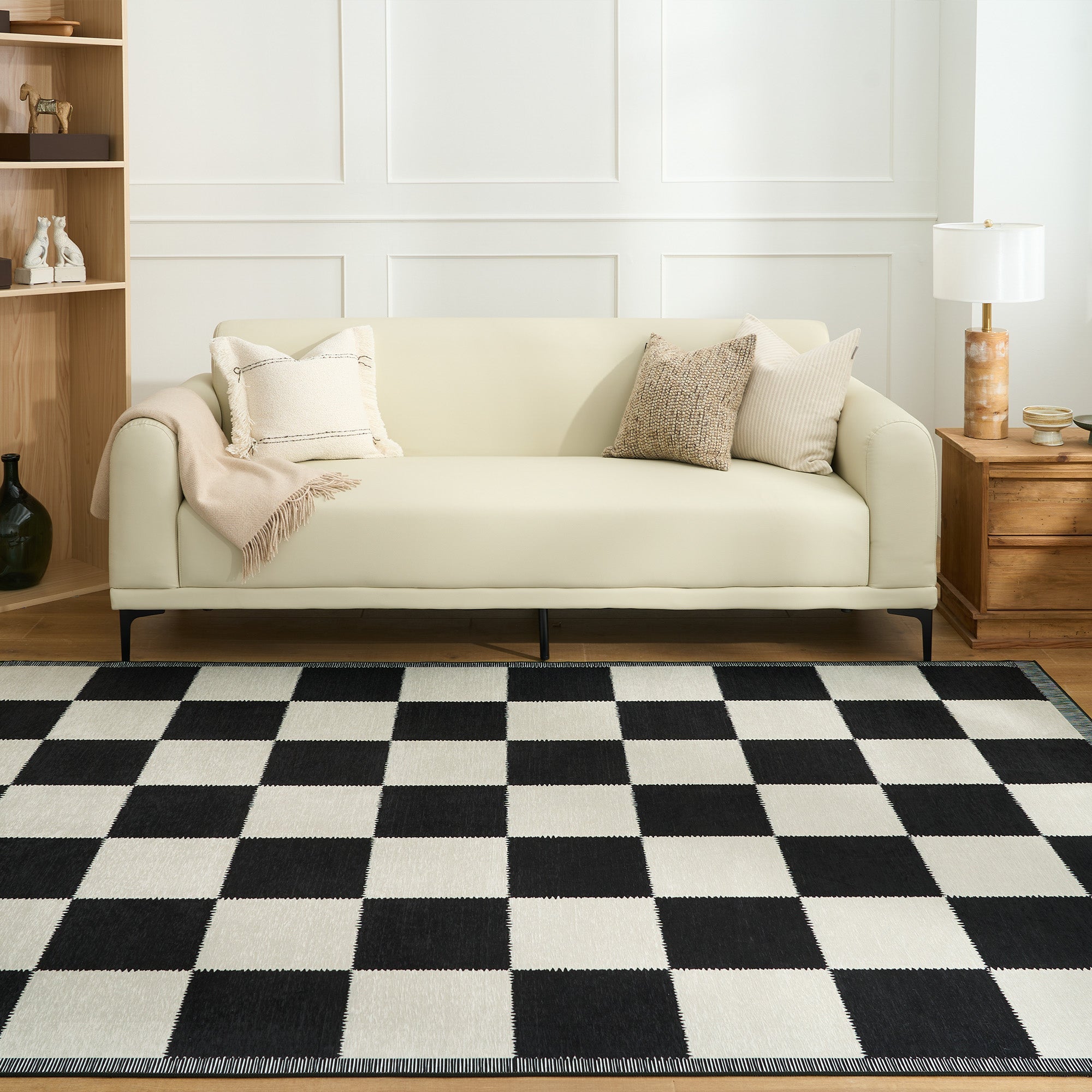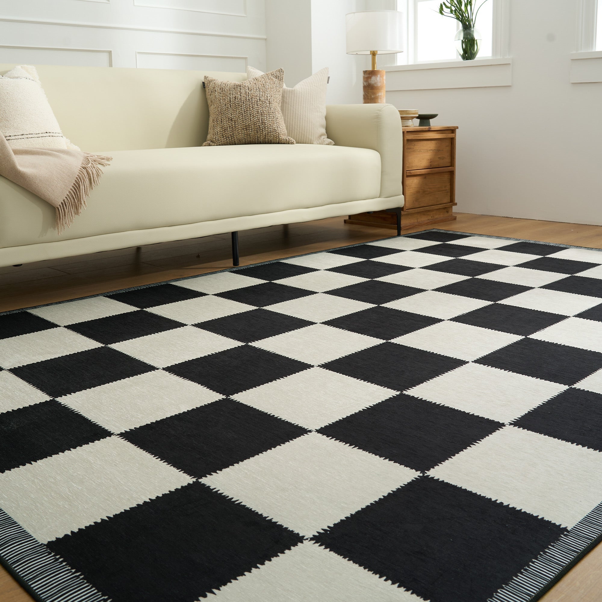 Easy Clean Washable Rug Timeless Noir Checkered Design Durable Spillproof Pet-Friendly Non-Slip Pad Living Room Area Rug