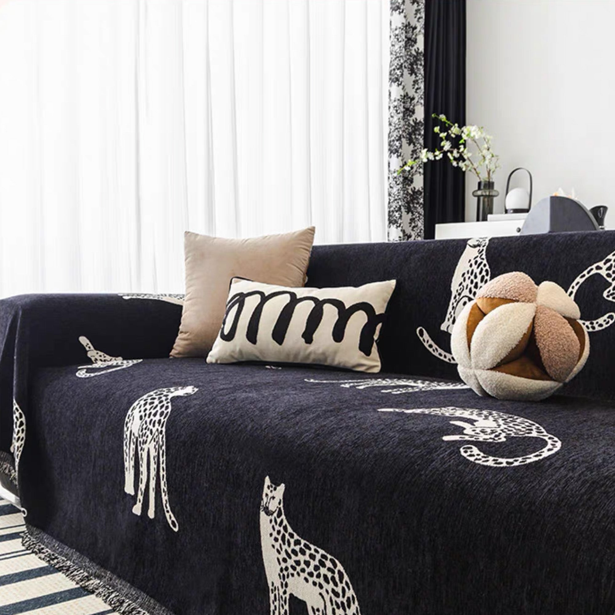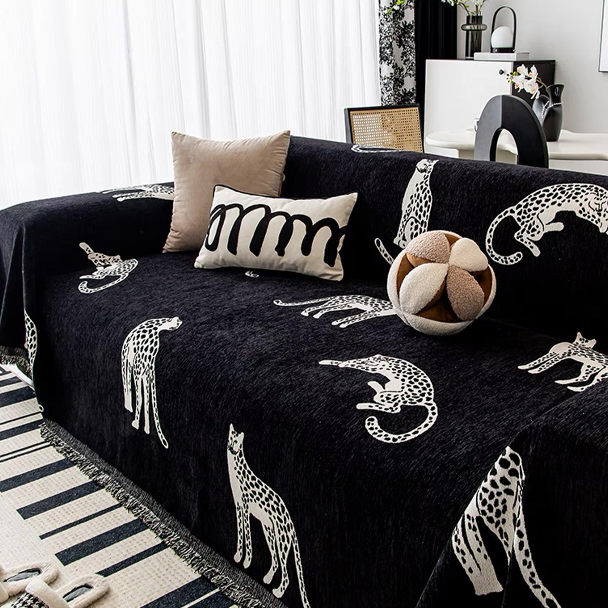 Add a bold and exotic flair to your living space with the Wild Elegance Sofa/Couch Cover. This cover features an eye-catching design of leopards in various poses on a sleek, dark background, bringing a unique and stylish look to your sofa. Crafted from soft, durable fabric, it’s perfect for creating a chic, adventurous vibe while protecting your furniture.