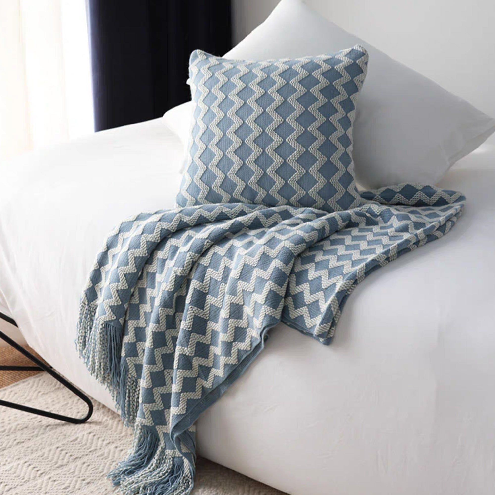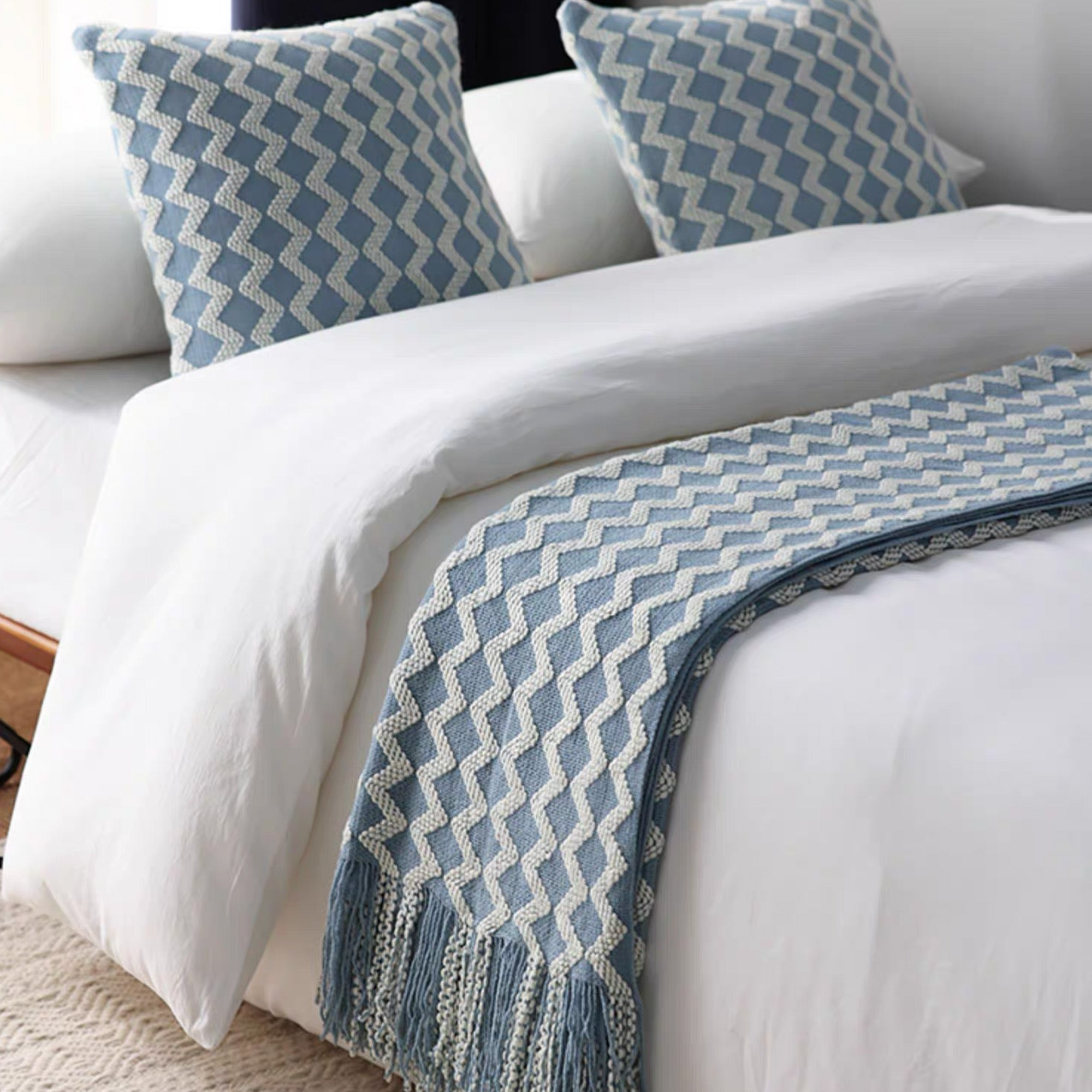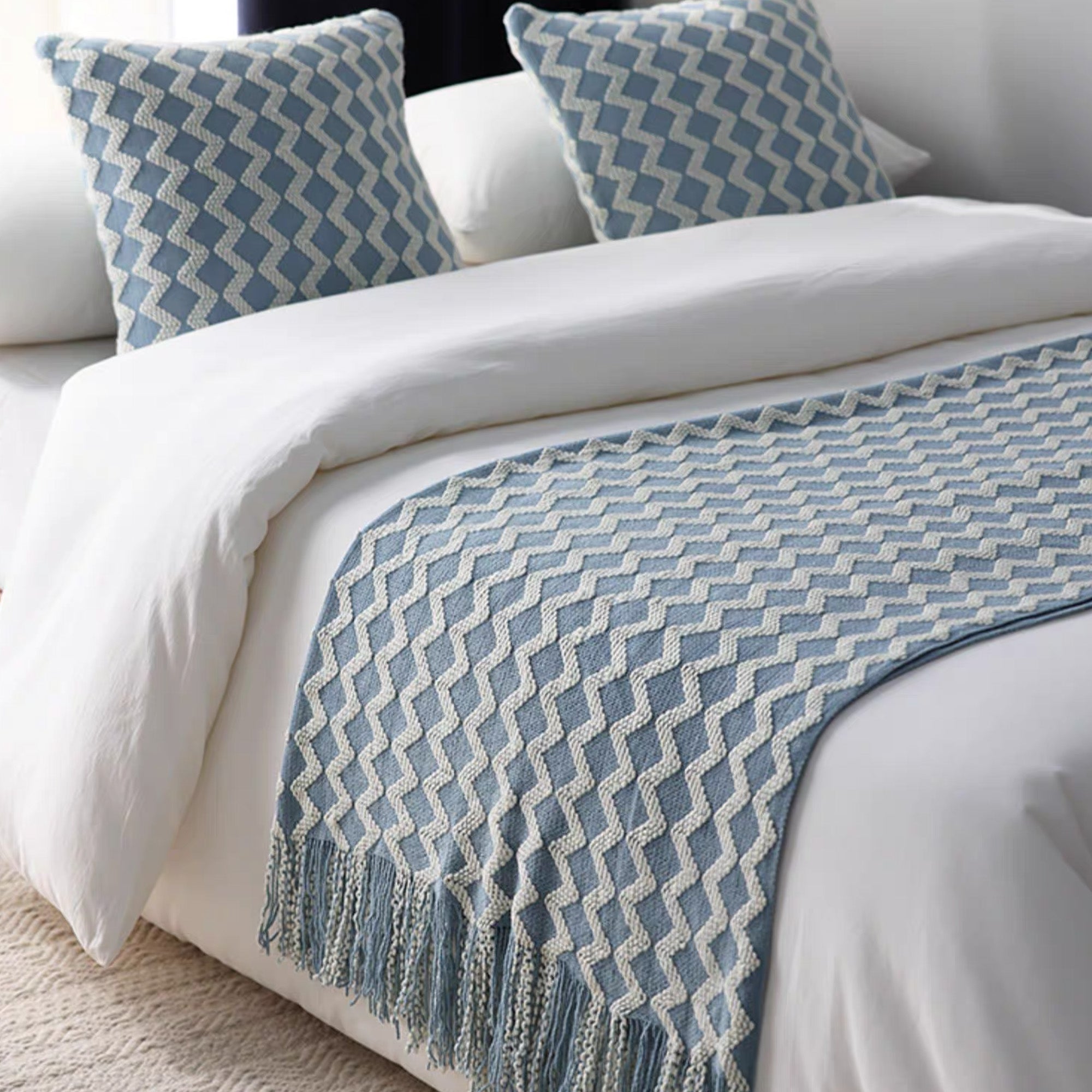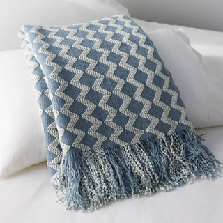 Elevate your relaxation with the Chevron Patterned Fringe Throw Blanket. This stylish throw features a bold chevron design in soothing blue and ivory tones, perfect for adding a pop of color and texture to your bedroom or living room. Made from a soft, breathable blend, it offers warmth without weight, making it ideal for all-season comfort.