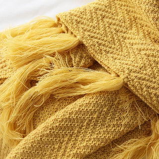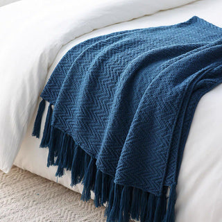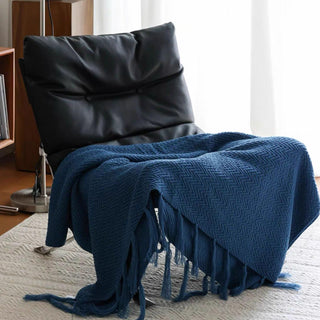 Embrace the warmth and elegance of Scandinavian design with our Nordic Knitted Throw Blanket. This richly textured, deep blue blanket showcases a classic herringbone knit pattern and is adorned with long, flowing tassels, adding a cozy and stylish layer to any room. Perfect for wrapping yourself up on chilly nights or as a beautiful decorative accent for sofas, beds, or reading corners.