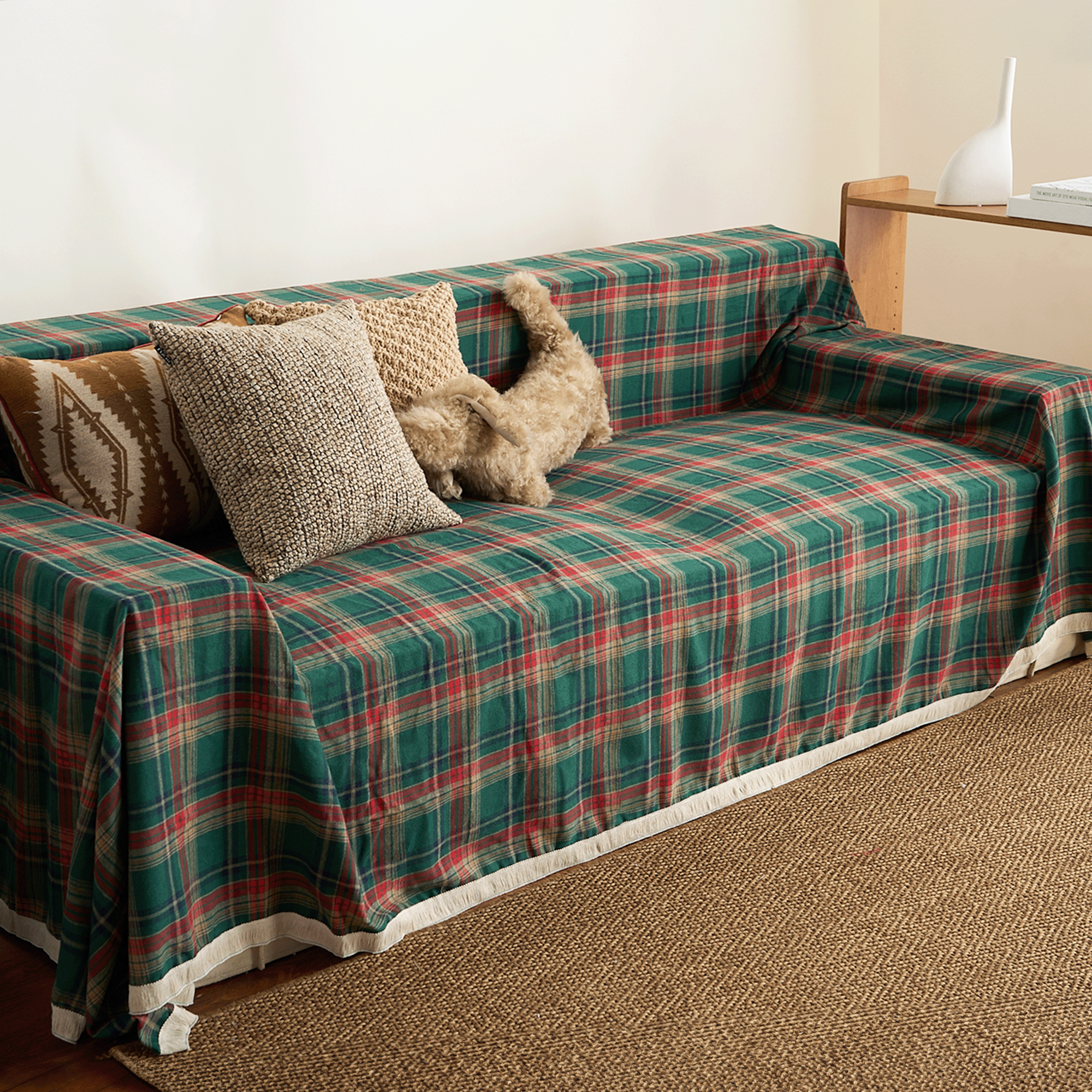 Deck your living room with the festive spirit of our Christmas Cheer Plaid Sofa Cover, a seasonal delight that's a gift for both you and your pets. This merry cover blends the softness of a polyester-cotton mix with the durability needed to withstand holiday excitement, ensuring a comfortable, yet resilient backdrop for your family gatherings. Its vintage checkered design weaves a thread of nostalgia, offering a timeless charm that complements any holiday decor. Beyond its beauty, this cover serves as a cozy haven for your furry friends, inviting them to join in the holiday cheer without worry.