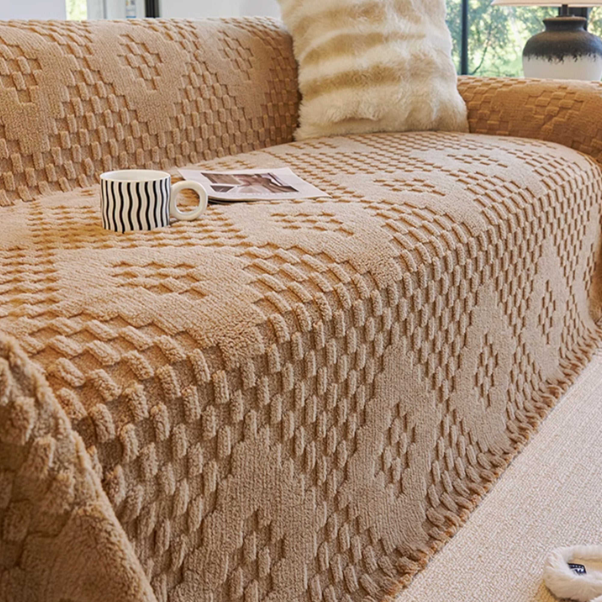 Elevate your living room with the Cozy Diamond Texture Sofa/Couch Cover, a stylish and cozy addition to your decor. Featuring a unique, raised diamond pattern, this cover adds visual interest and a plush feel to your seating area. Crafted in a warm, neutral tone, it effortlessly blends with various interior styles while providing a layer of protection to your sofa.