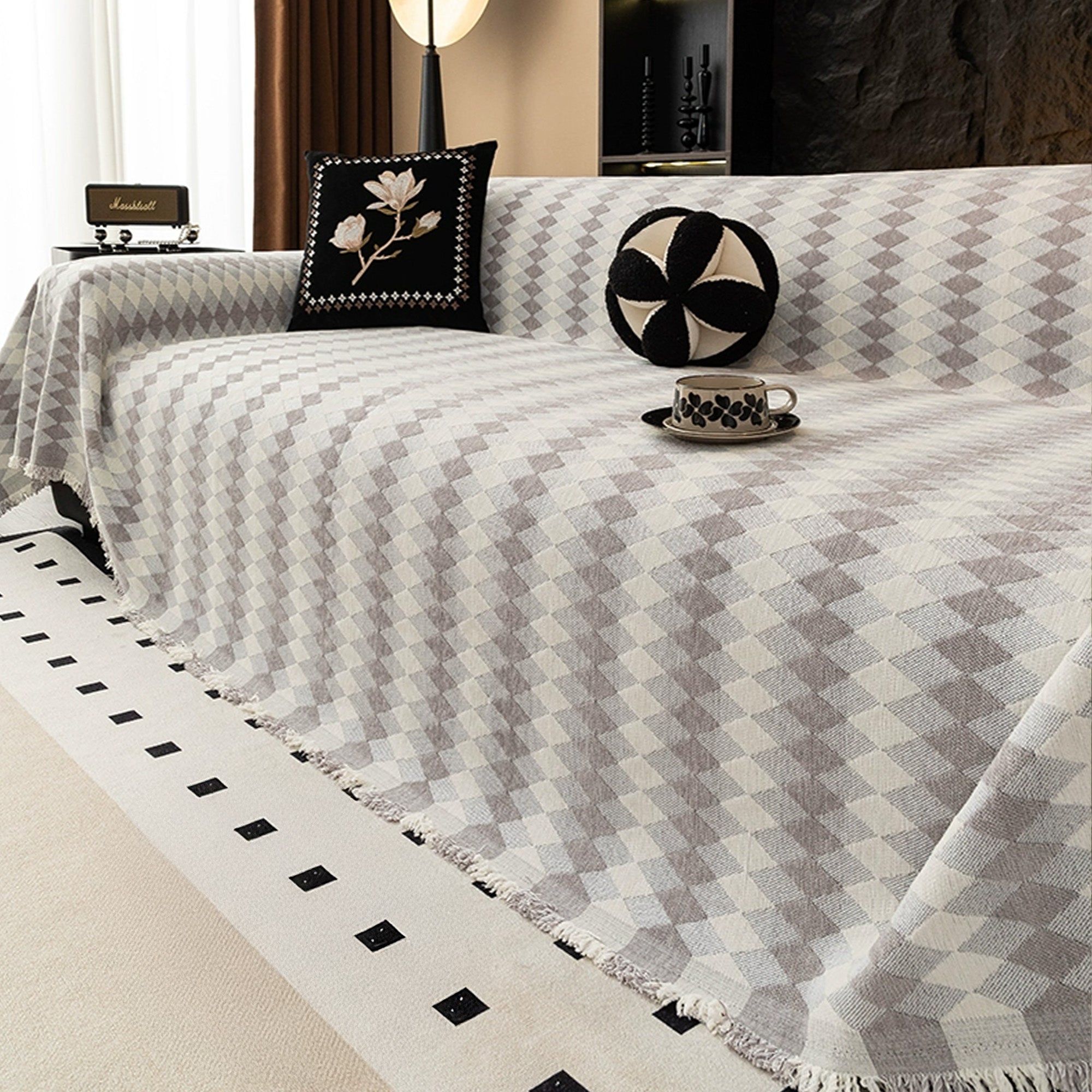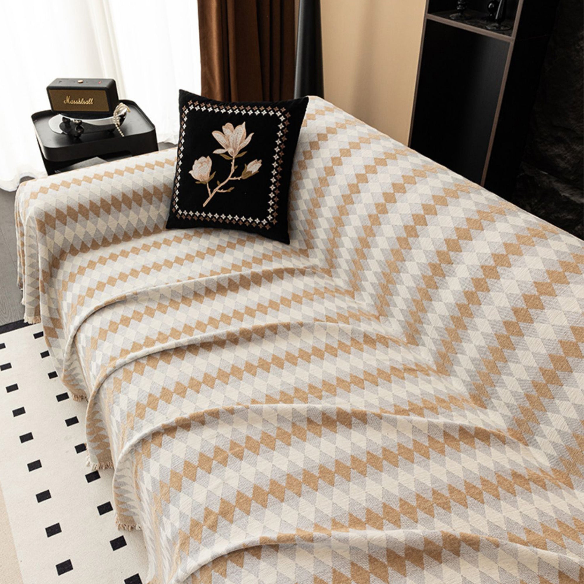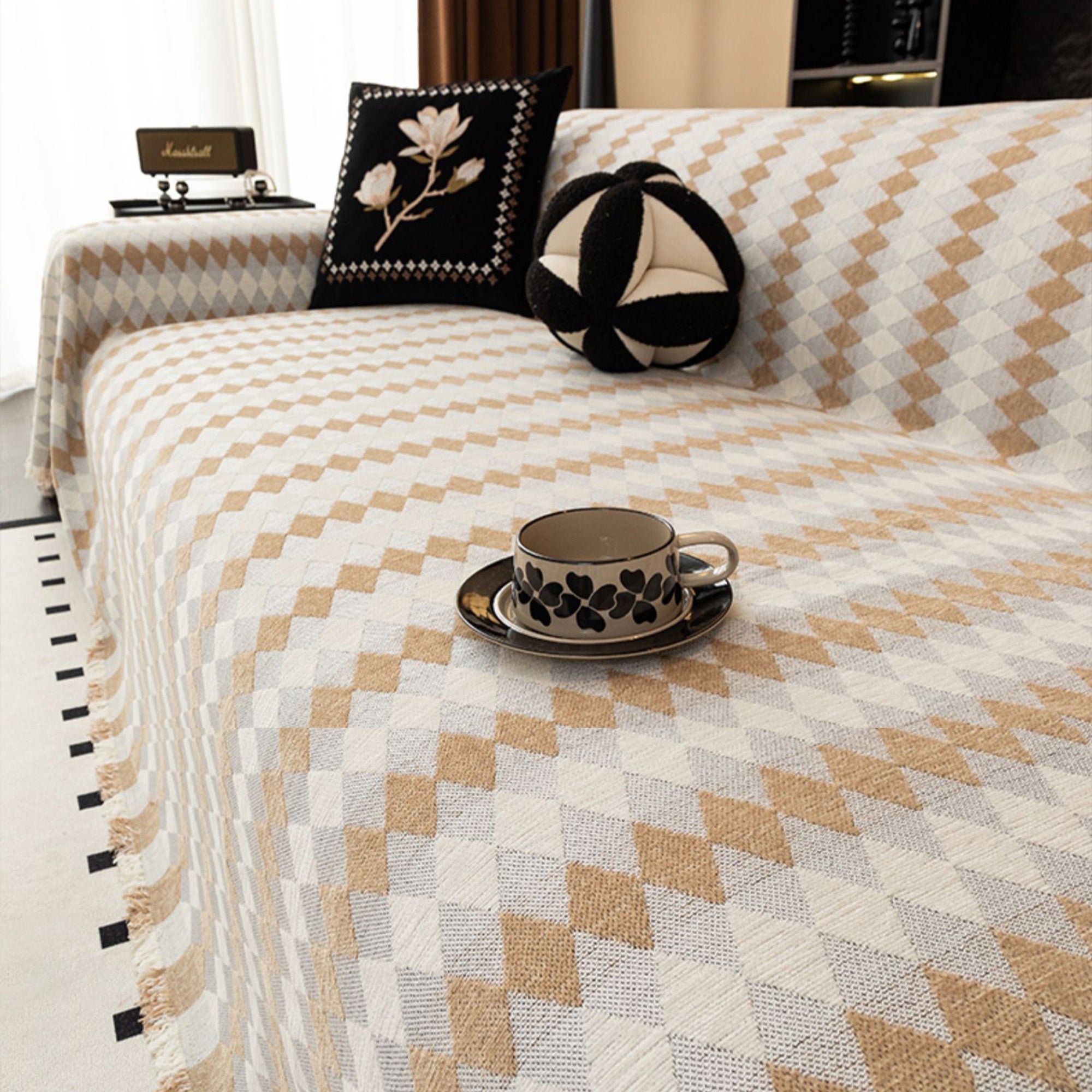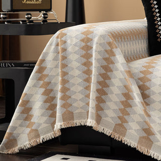 Modern geometry meets plush comfort in the Diamond Drift Sofa Cover. Woven from ultra-soft chenille yarns, this cover features a striking diamond lattice pattern that adds visual rhythm and contemporary elegance to your living space. With its rich texture, full-coverage drape, and subtle fringe finish, it's both functional and beautifully styled for everyday life.