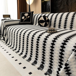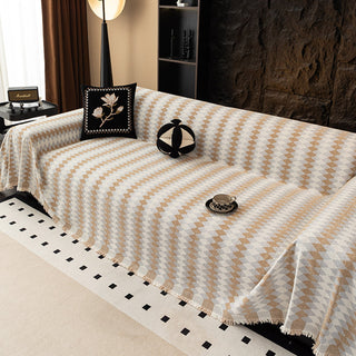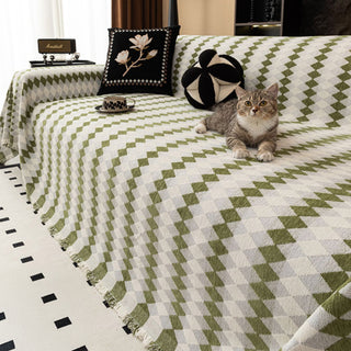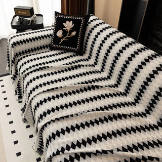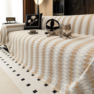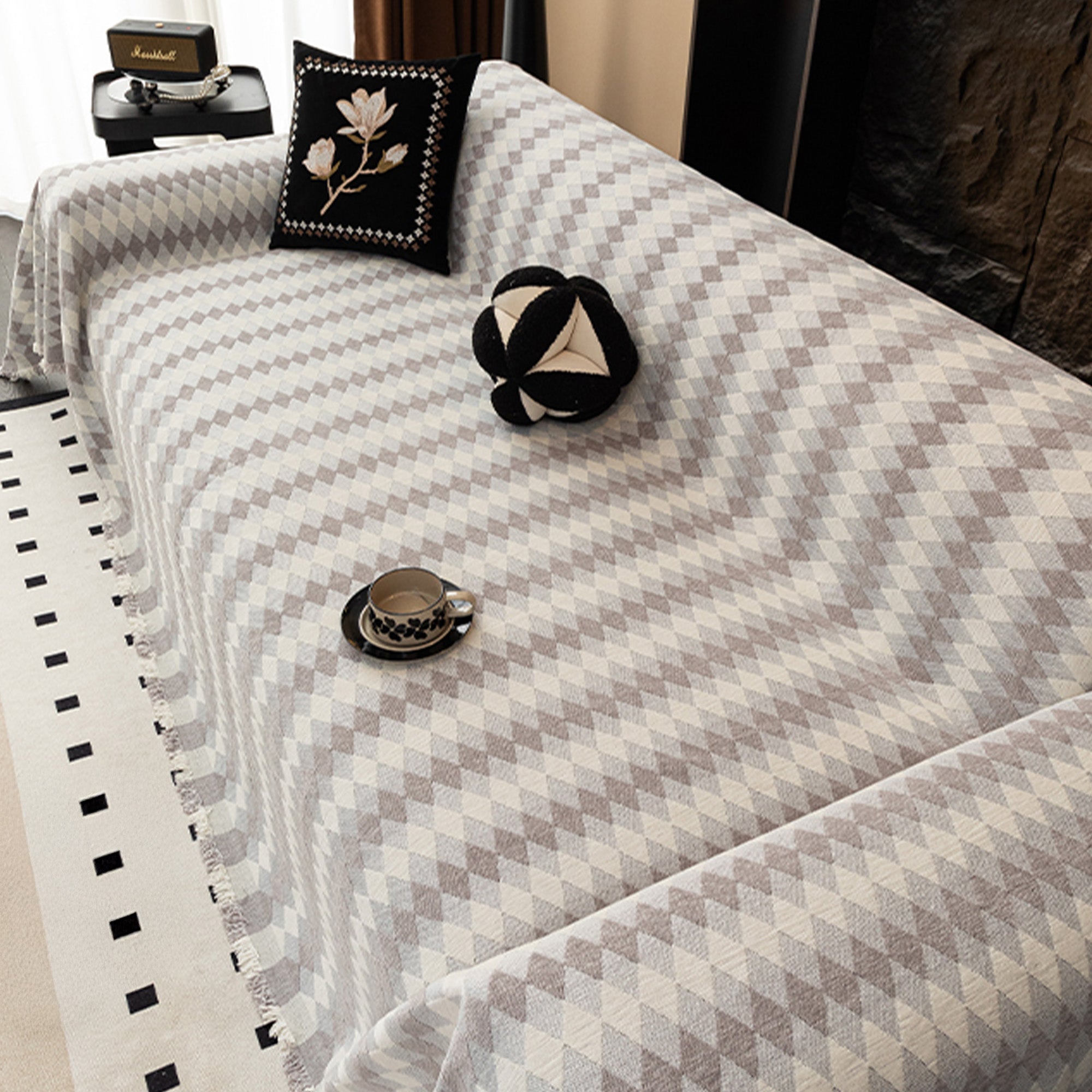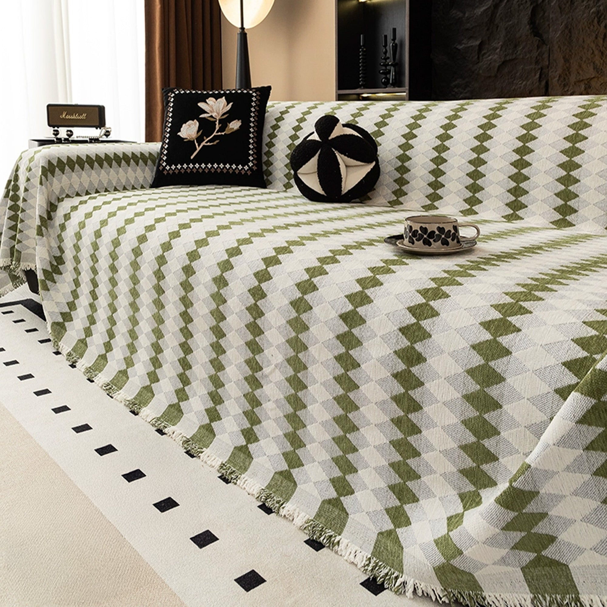 Modern geometry meets plush comfort in the Diamond Drift Sofa Cover. Woven from ultra-soft chenille yarns, this cover features a striking diamond lattice pattern that adds visual rhythm and contemporary elegance to your living space. With its rich texture, full-coverage drape, and subtle fringe finish, it's both functional and beautifully styled for everyday life.