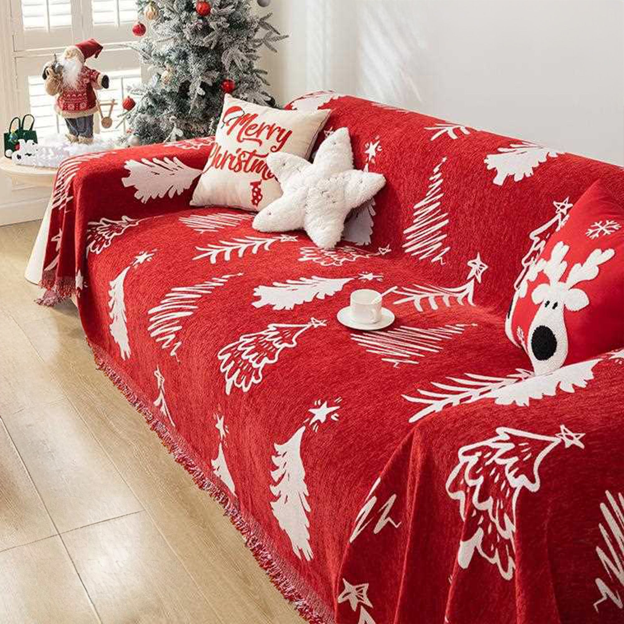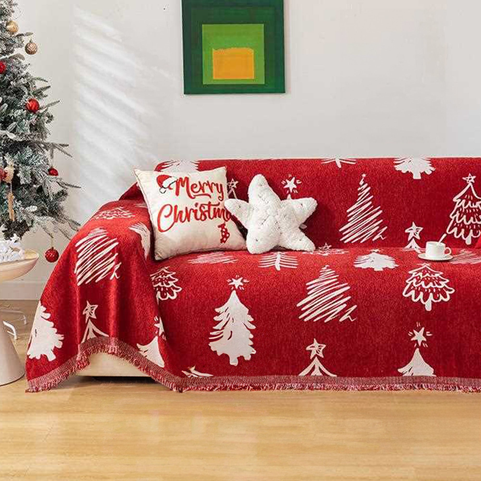 Merry Christmas Chenille Sofa Cover Festive Red with Tree & Star Design for Holiday Decor