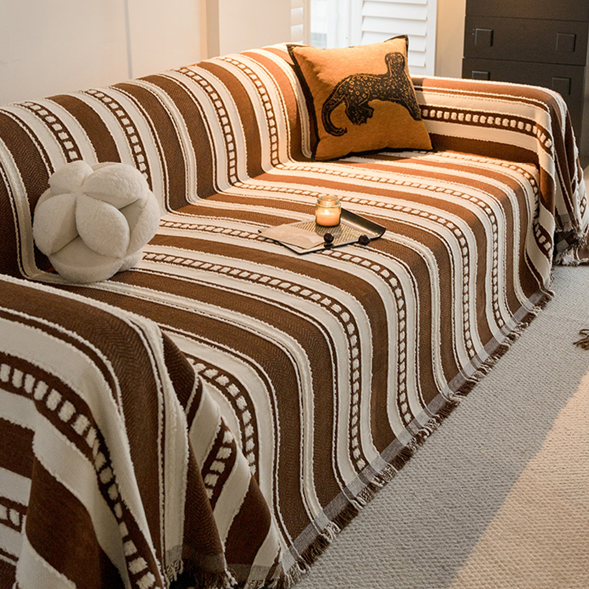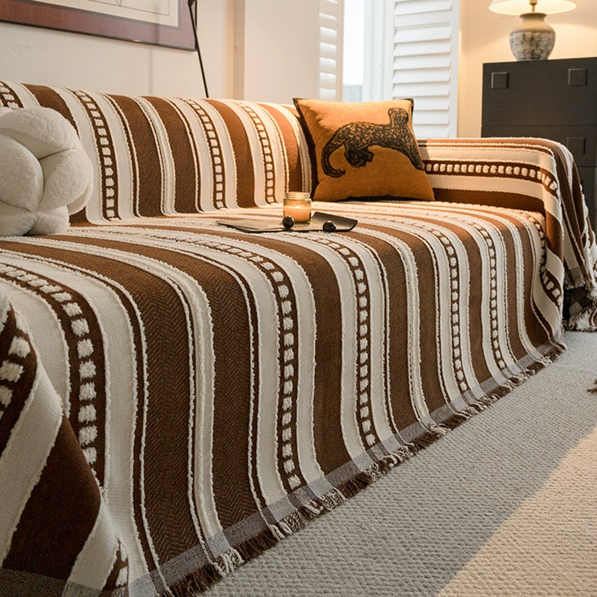 Evoking the warmth of desert earth and the boldness of tribal rhythm, the Savanna Rhythm Chenille Sofa Cover offers a rich, tactile upgrade to any living space. Its alternating woven stripes and raised dotted bands are inspired by indigenous textile artistry, brought into modern interiors through luxurious chenille yarns and high-contrast palettes. Finished with a soft fringe, this cover is as inviting as it is eye-catching — a striking blend of comfort and character.