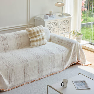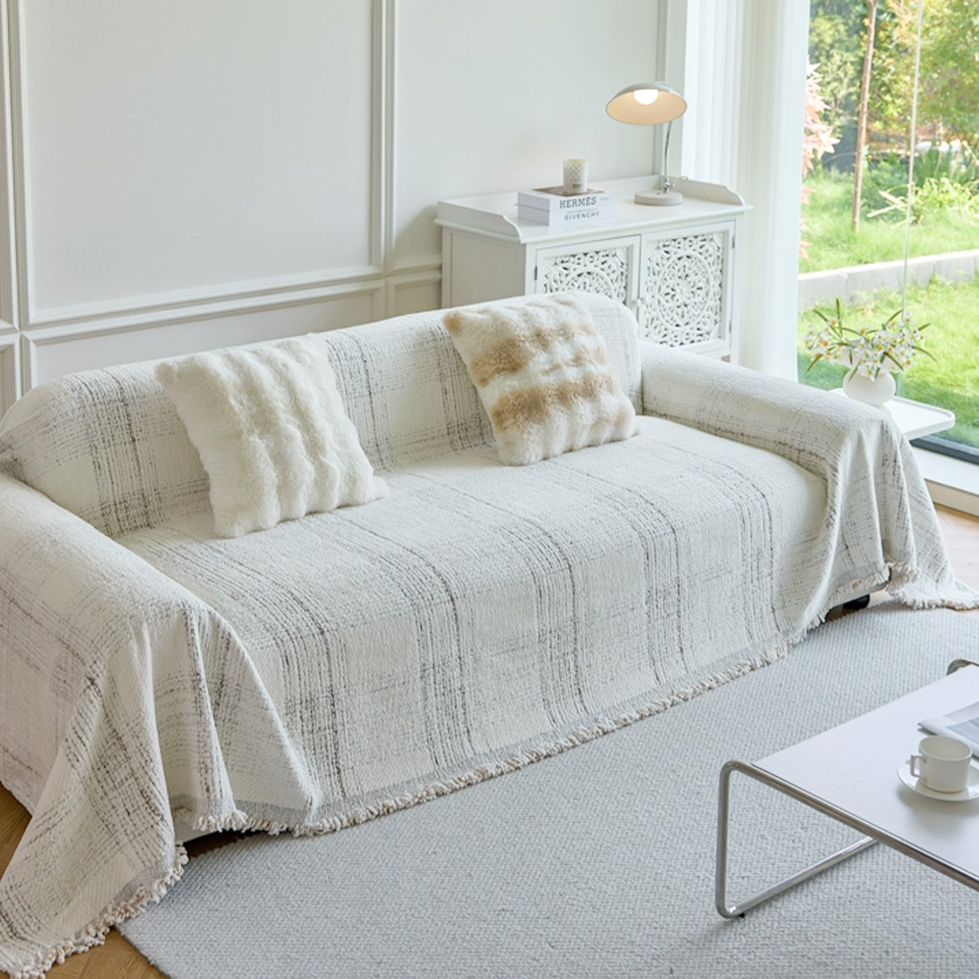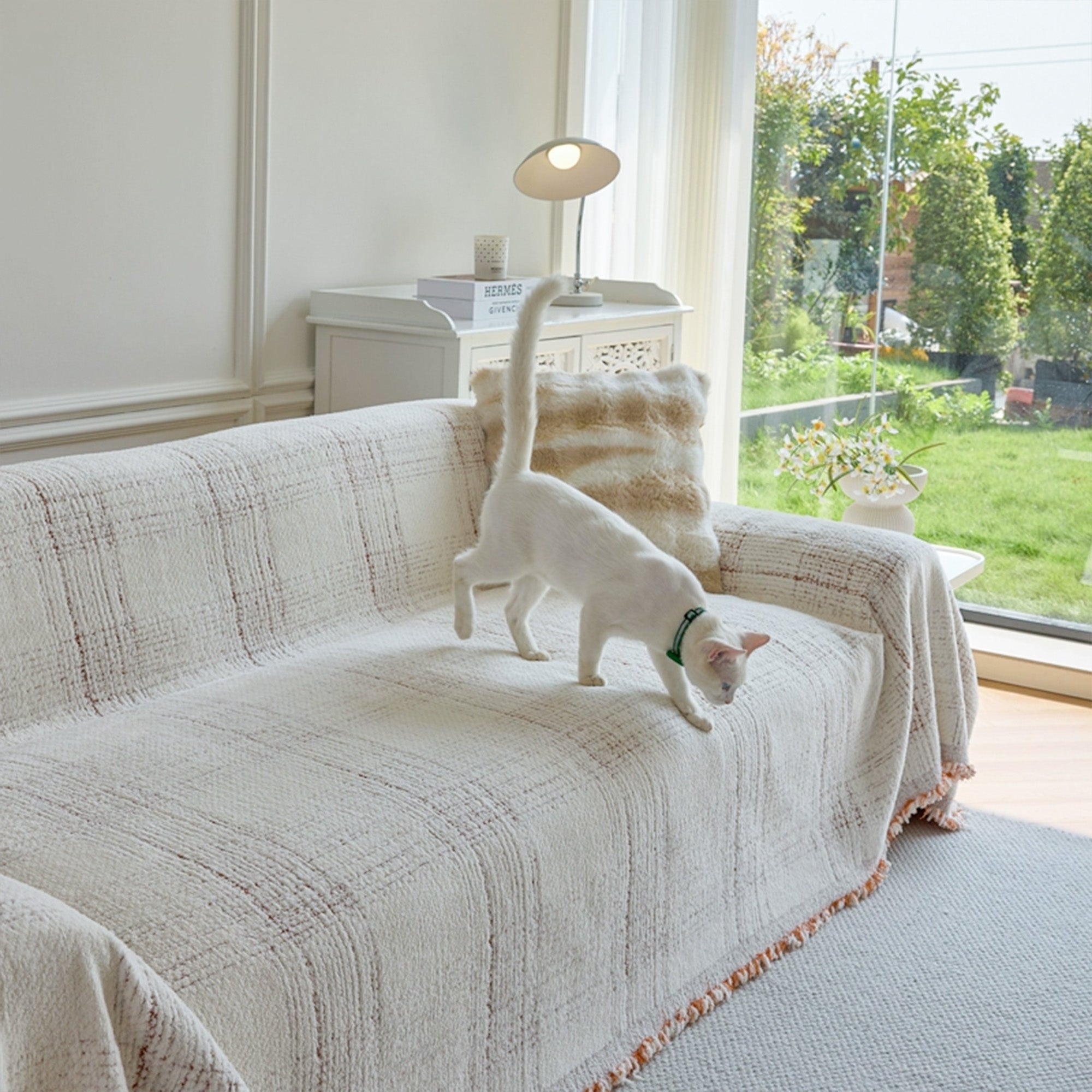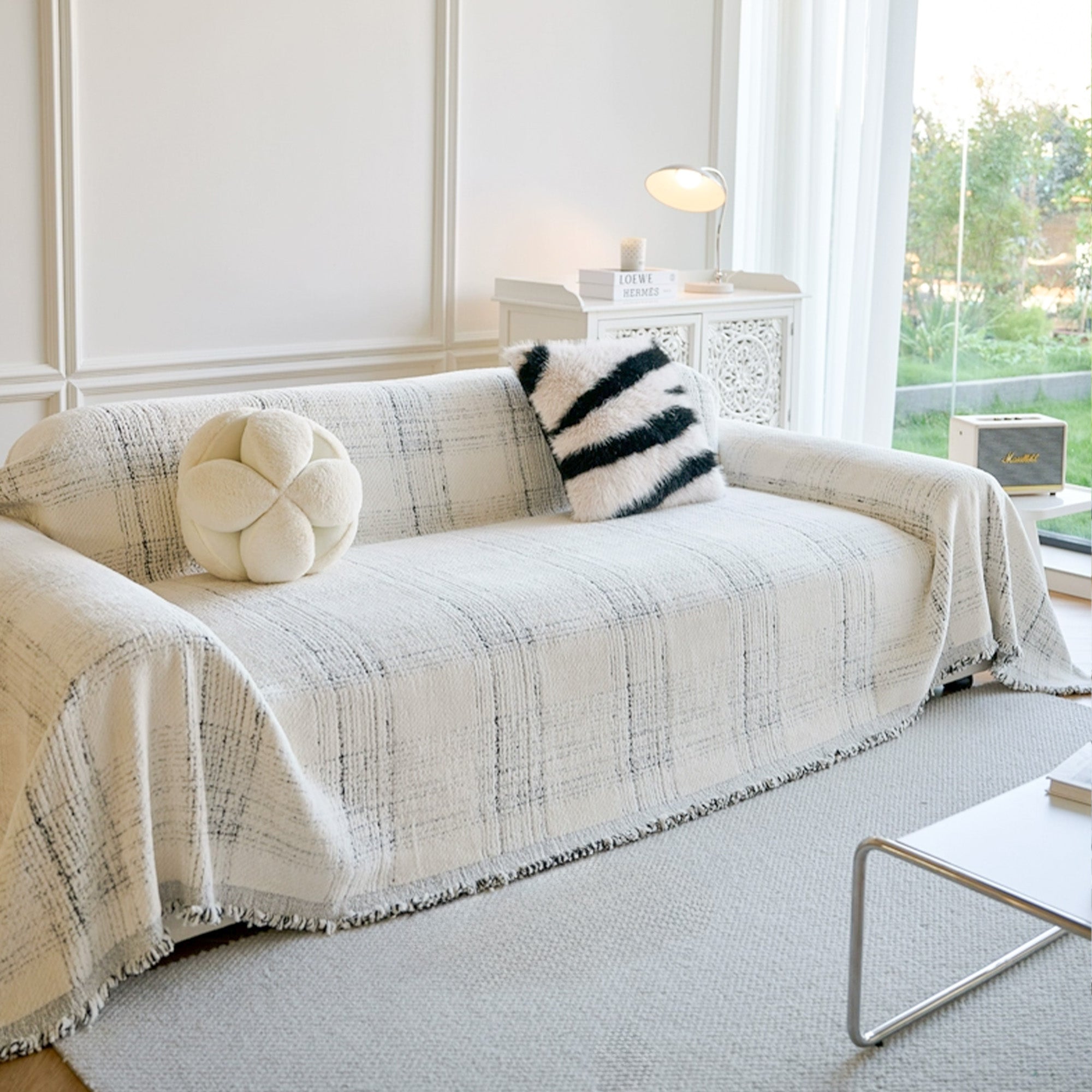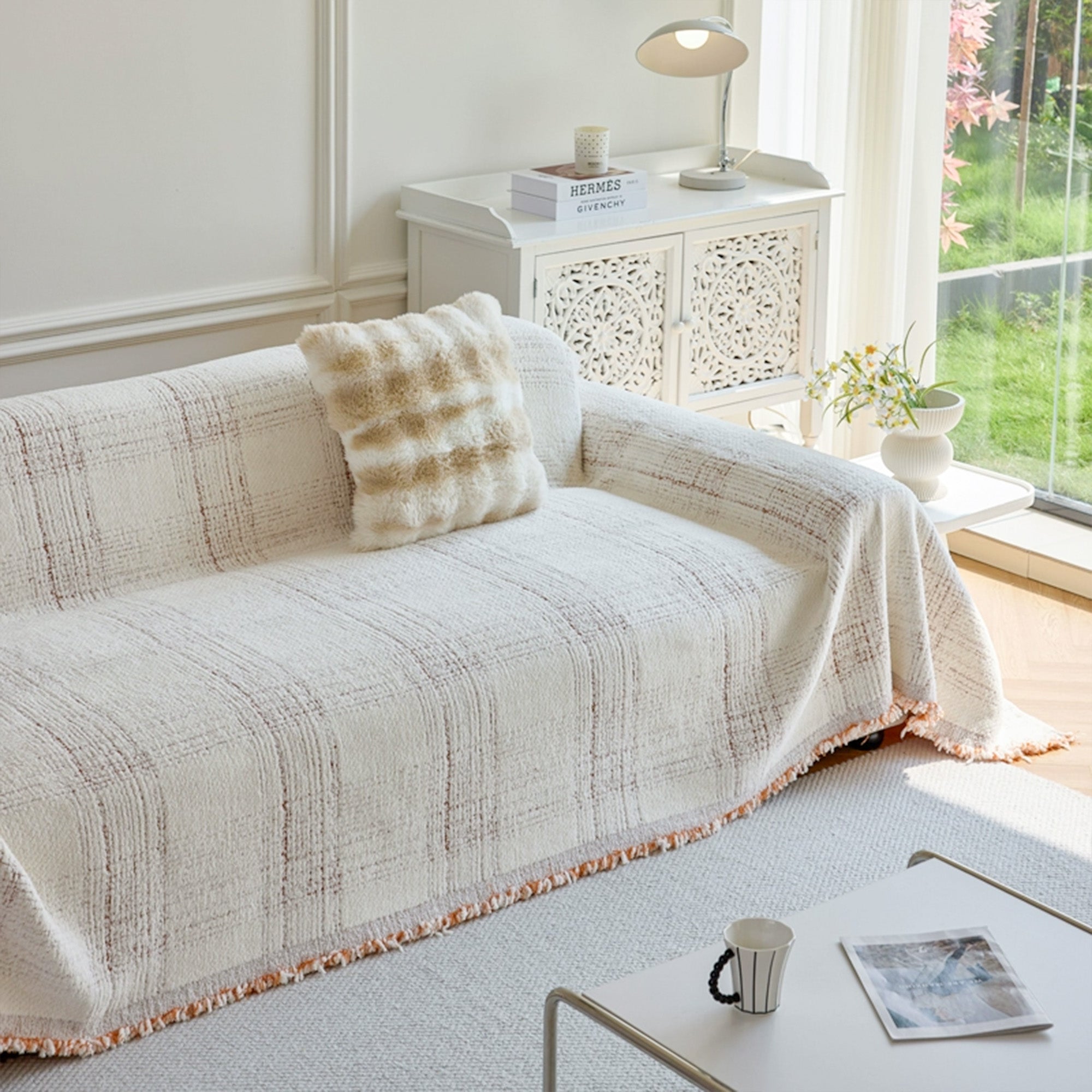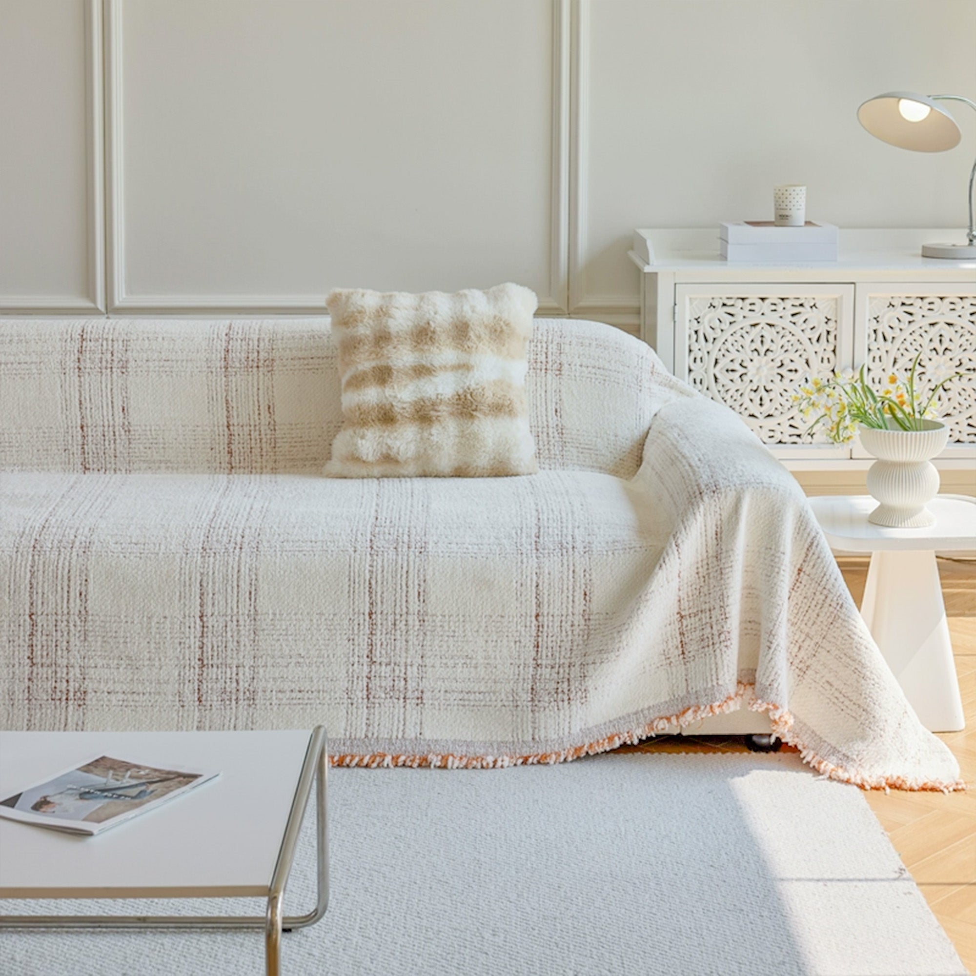Subtle pattern, soft luxury — the Twill Calm Chenille Sofa Cover blends understated elegance with inviting texture. Woven in plush chenille with a lightly distressed plaid design, it offers a warm and balanced visual that complements everything from modern neutrals to romantic, French-inspired interiors. Finished with delicate fringe, it feels as cozy as it looks.